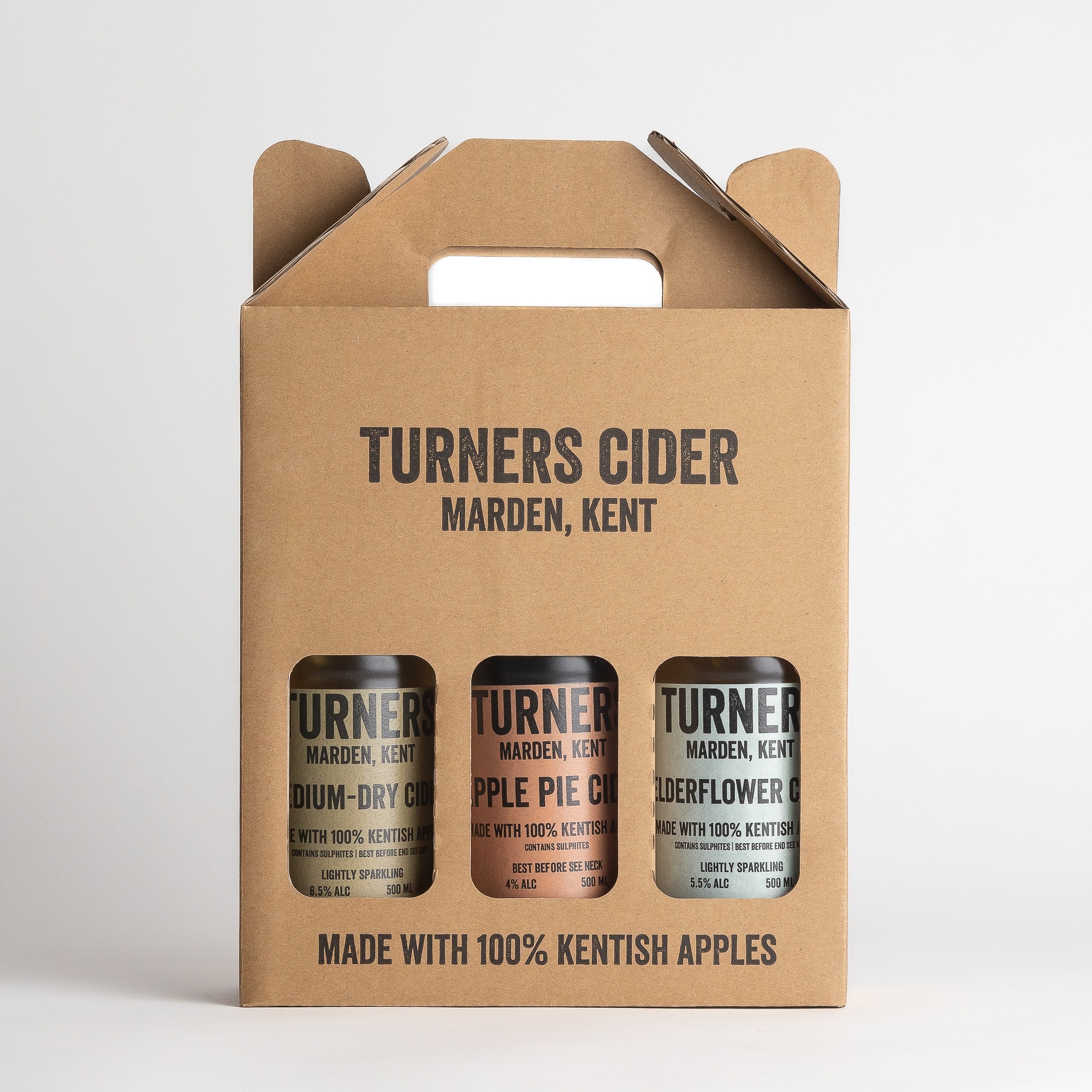 8.0% ABV. Lightly sparkling, well rounded and full flavoured with a touch of nuttiness and medium-dry finish. Unfiltered. It is made with 100% Kentish Russet Apples by Turners In Marden, Kent. The classic 3 x 500ml bottle gift set is ideal for birthdays, Christmas, Father’s and Mother’s Days, or just as a special thank-you. Neatly packaged in a branded Turners Cider craft cardboard gift set box with a carrying handle.
