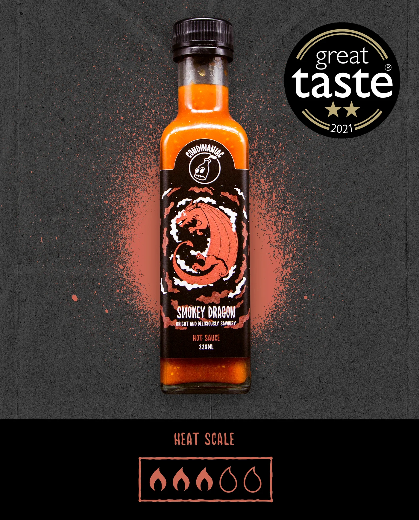 227g. Smokey Dragon Hot Sauce. A medium hot artisan sauce made with a savoury bullet chilli and garlic base, then flavoured with the ‘Komodo Dragon, ‘ the world’s second hottest chilli. Heat 3/5. Goes great with Burritos, pizza & chicken.